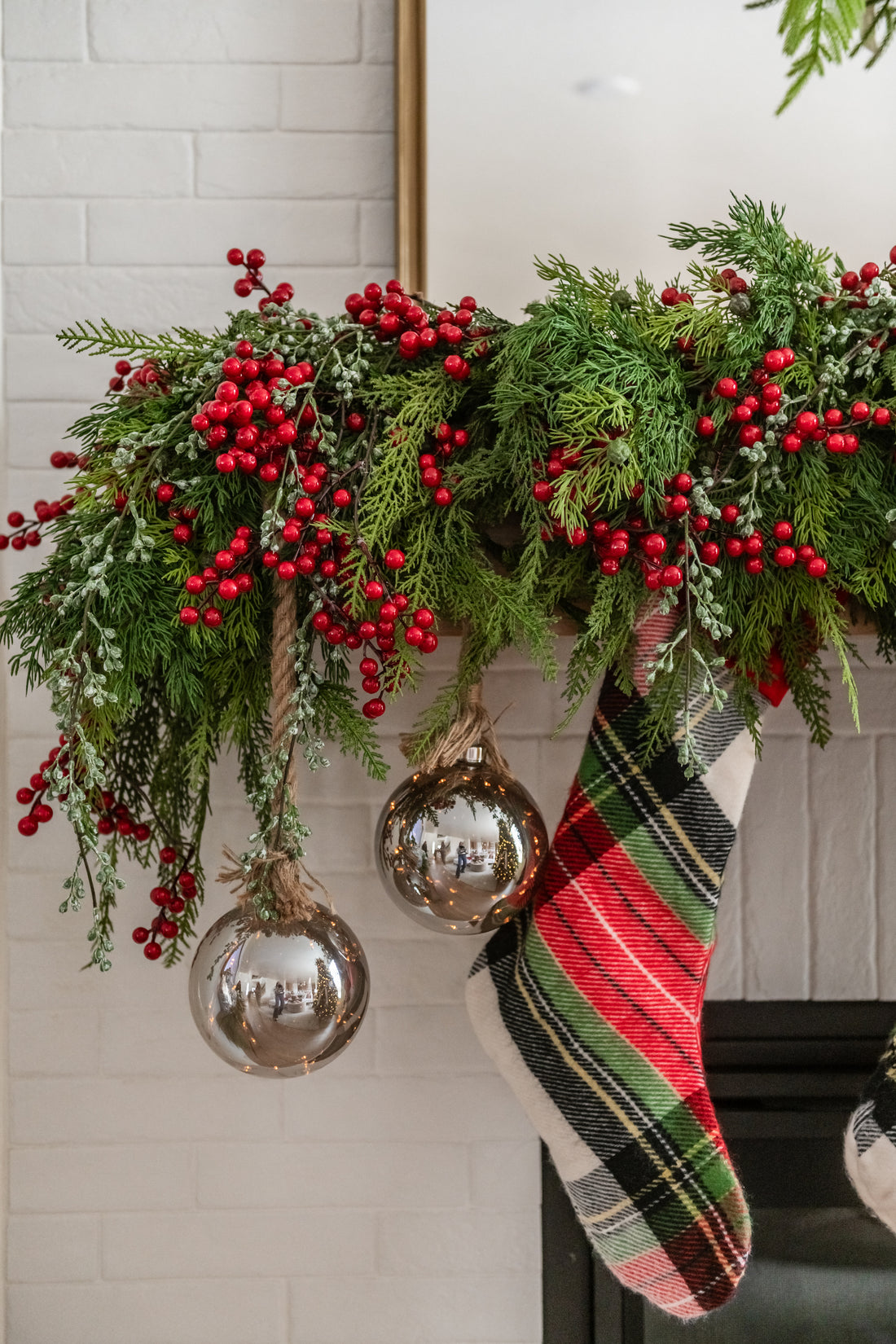 Don't forget to dress your mantel with our GH Signature Cedar Garland . Shown here intertwined with red berry vines that pop of the natural greens. Balancing out the asymmetrical greenery, are lit ornaments to give a warm glow.