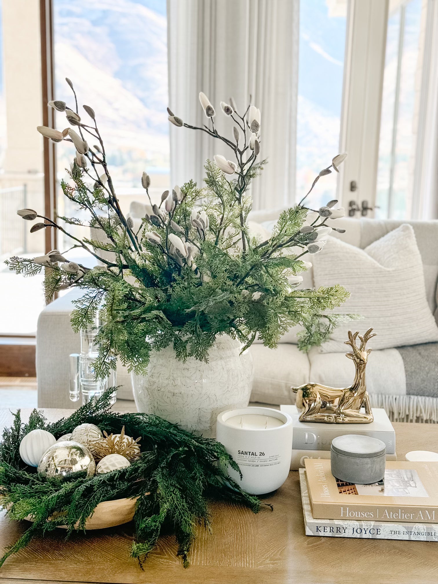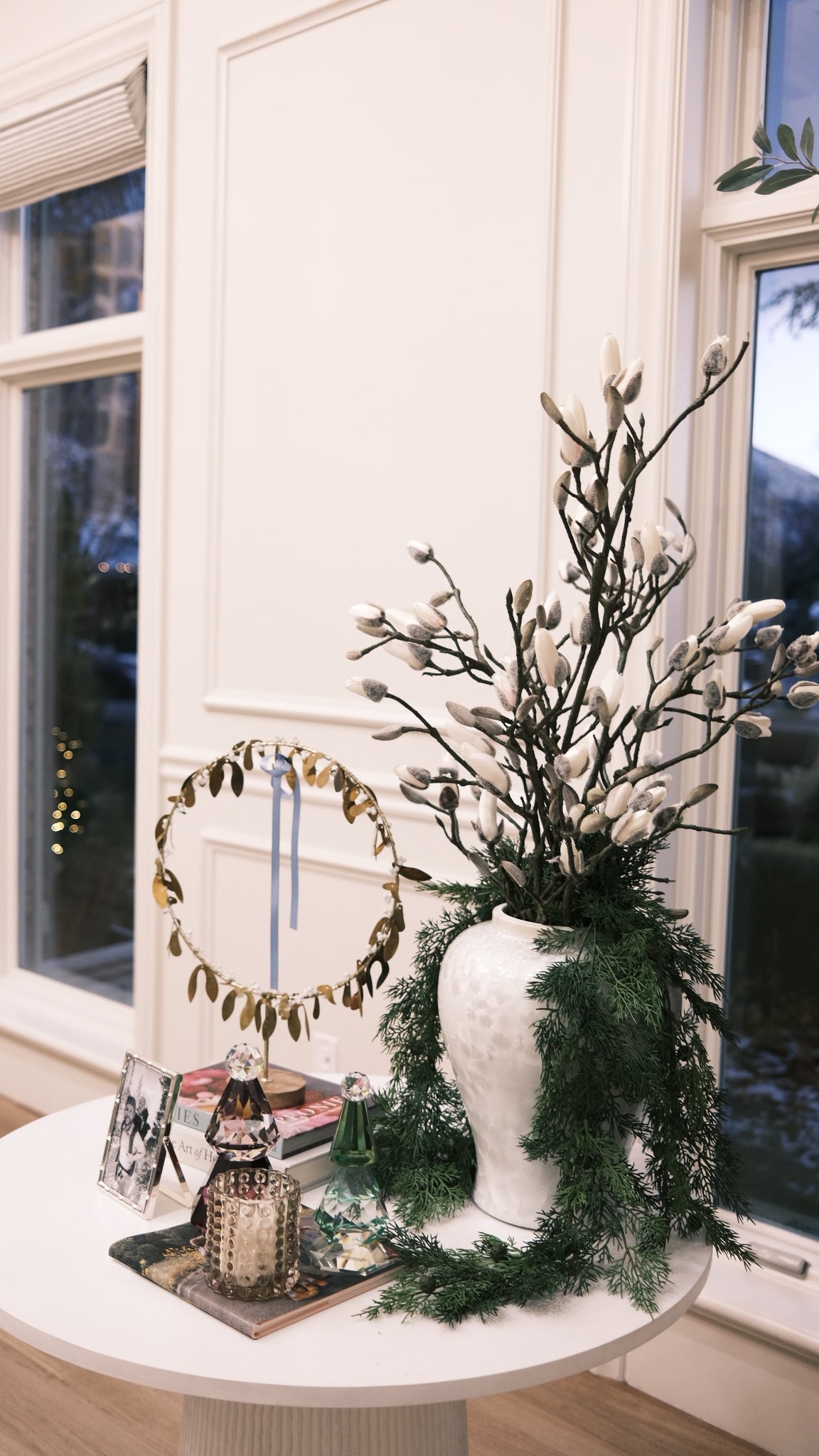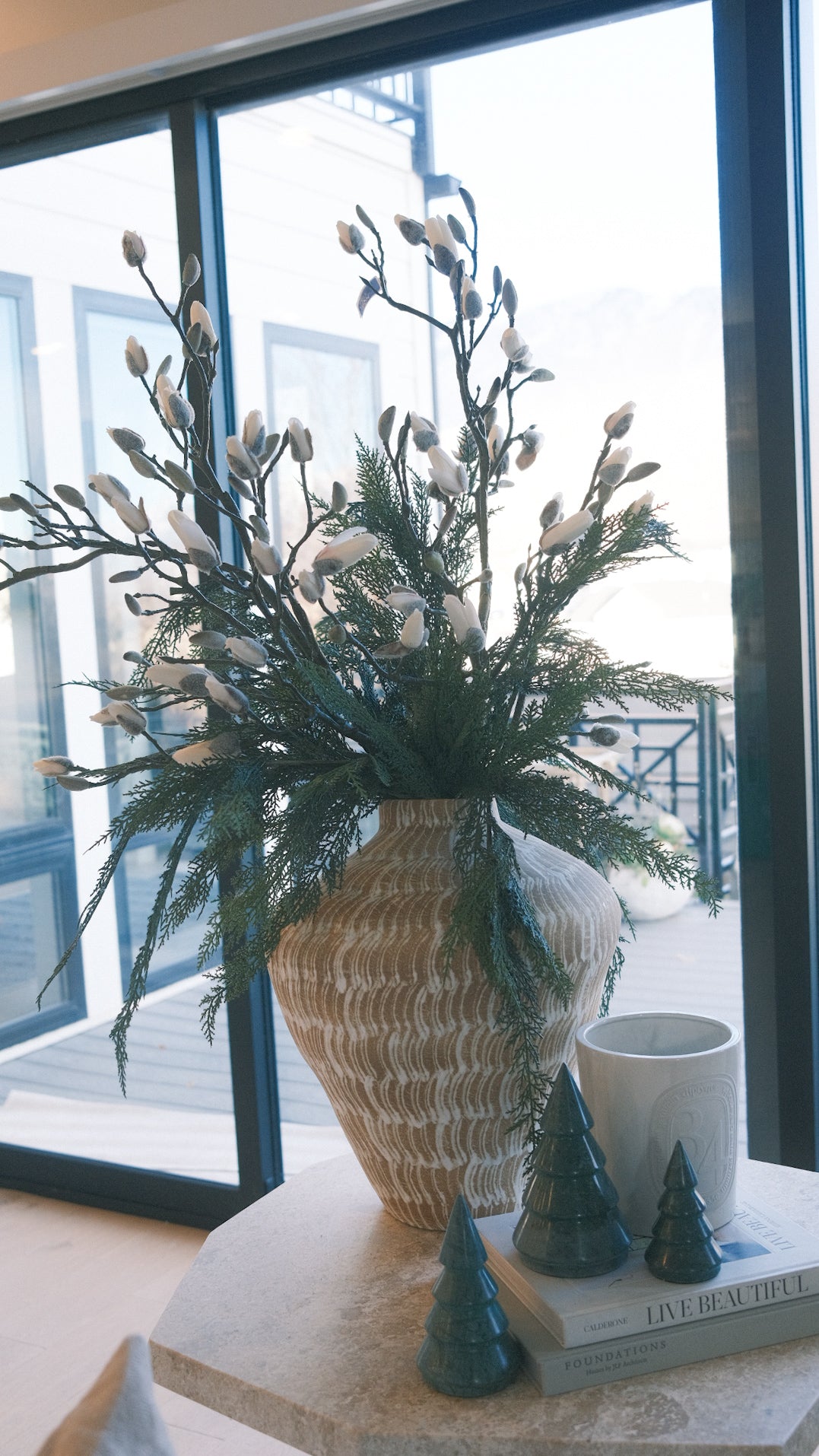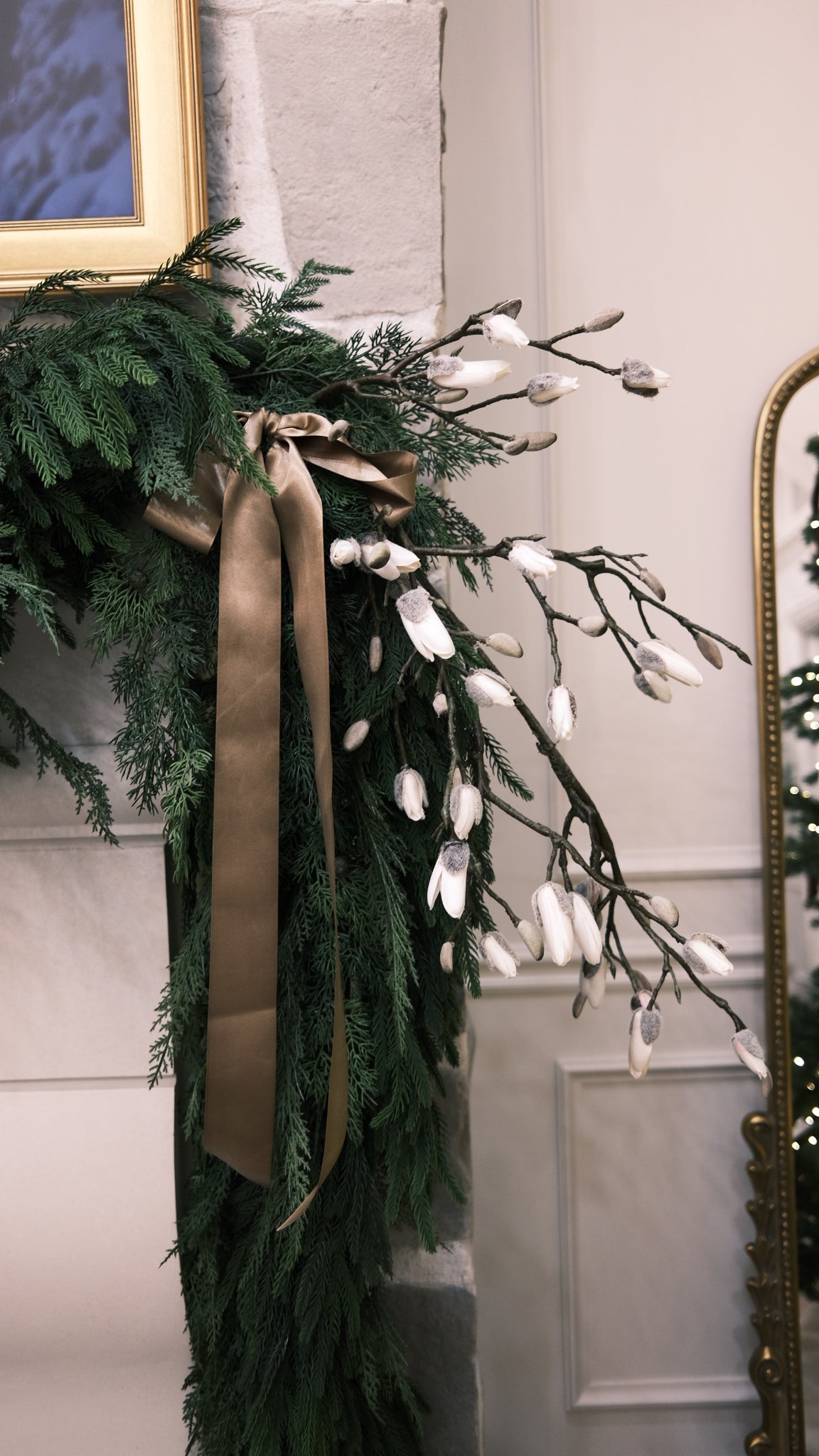Make a statement with this 60" Cream Magnolia Bud Branch, featuring thick, natural-looking twigs and delicate snowy cream magnolia florals in full blooming bud stages. Its large size and realistic design make it perfect for elevating large vase arrangements, creating dramatic mantel displays, or adding sophisticated depth to your holiday trees.