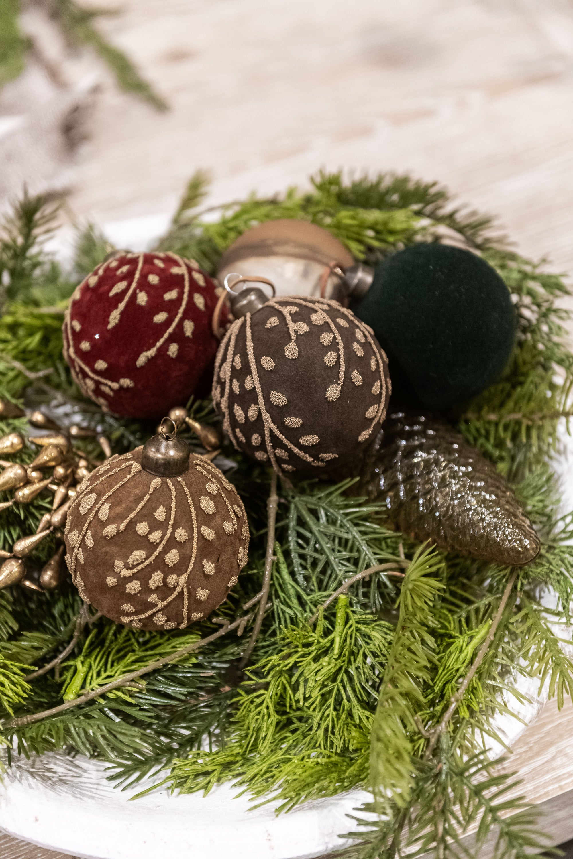 We love this 3" glass velvet ornament. Covered in a layer of rich burgundy velvet, crafted with details of golden beads. The beading creates an elegant leaf pattern spiraling across the globe surface.