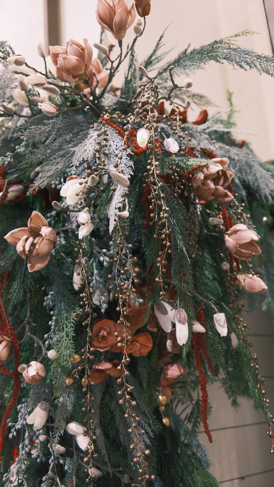 Elevate your holiday décor with this large 39.5" Blush Magnolia Branch. Featuring richly textured, realistic brown bark and delicate blush magnolia petals in both bloom and bud, it offers a refined statement piece that naturally draws the eye. Ideal for sophisticated floral arrangements and festive displays, this branch brings understated elegance and seasonal charm to any setting.