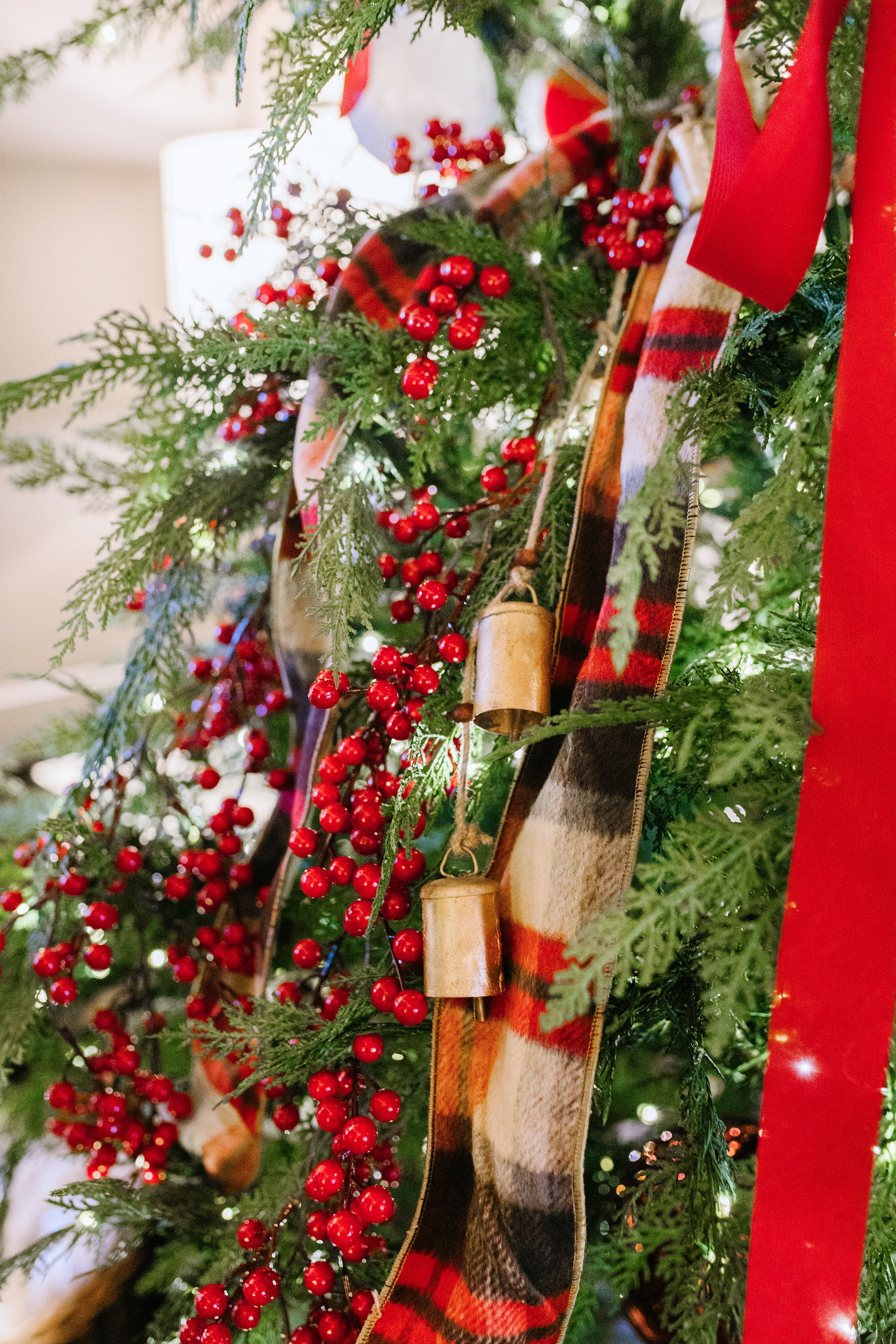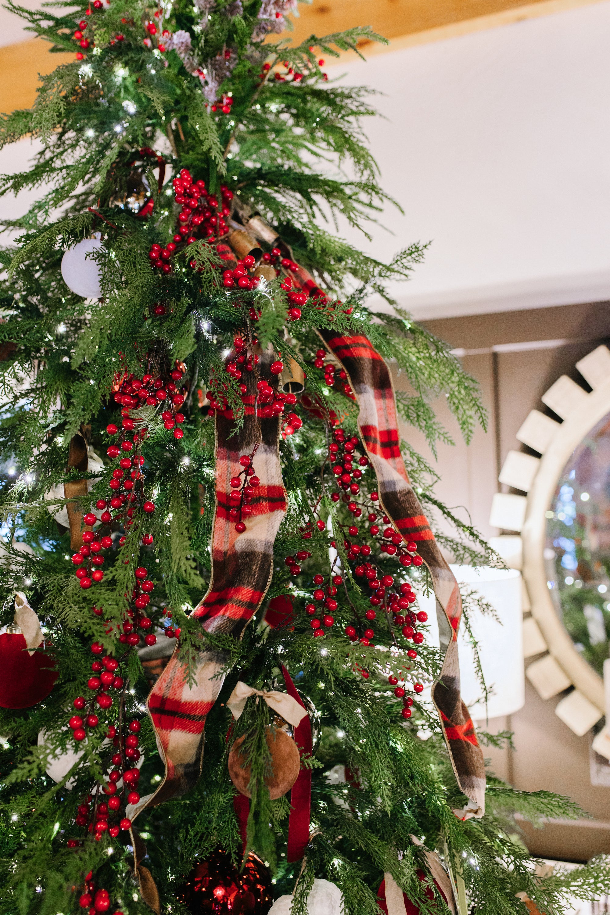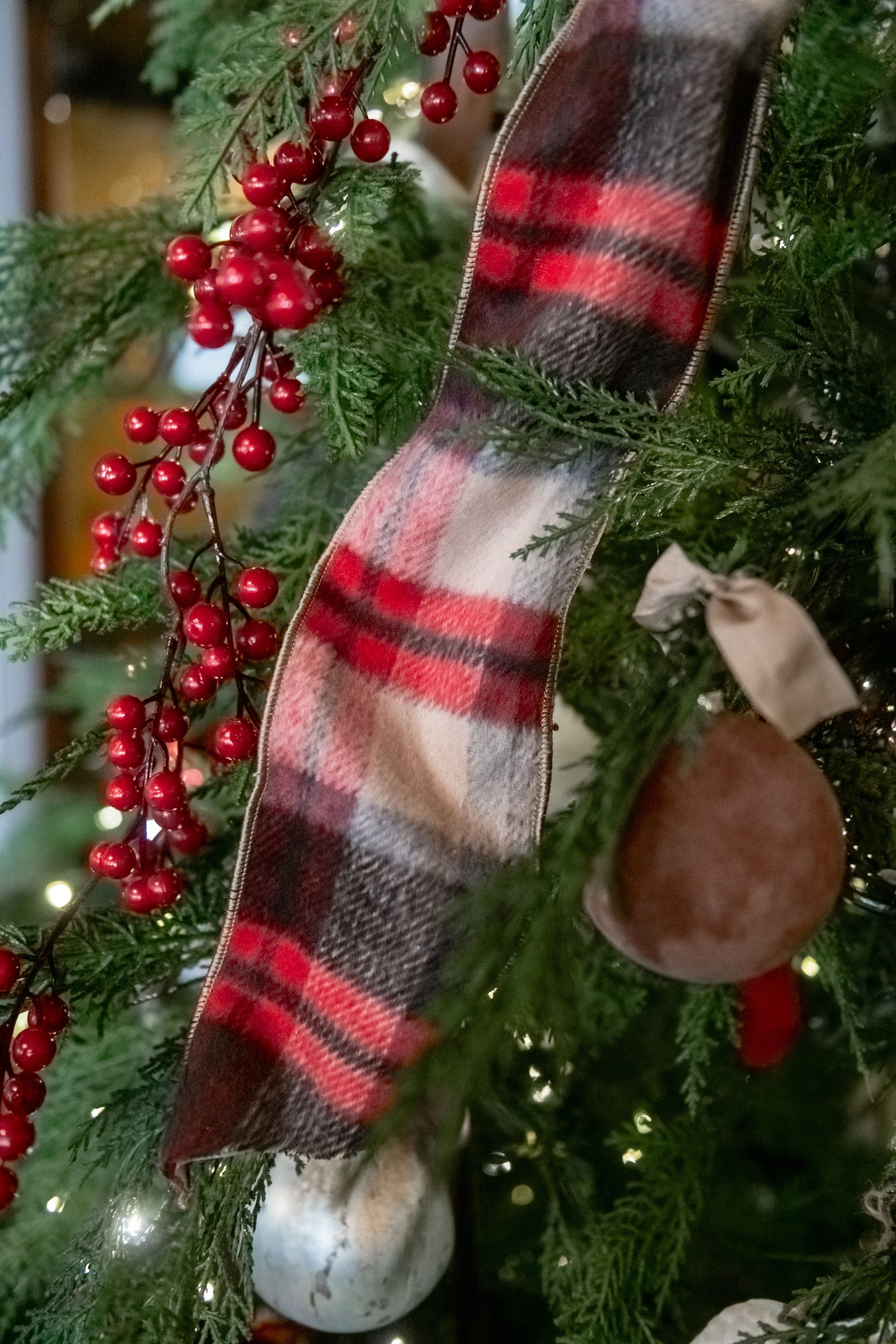 Wide brown and red plaid ribbon. Giving the look of a cozy winter scarf, we love this wide plaid ribbon. Warm colors of brown meet a classic holiday red for a beautiful look you will love to tie into your trees and wreaths.