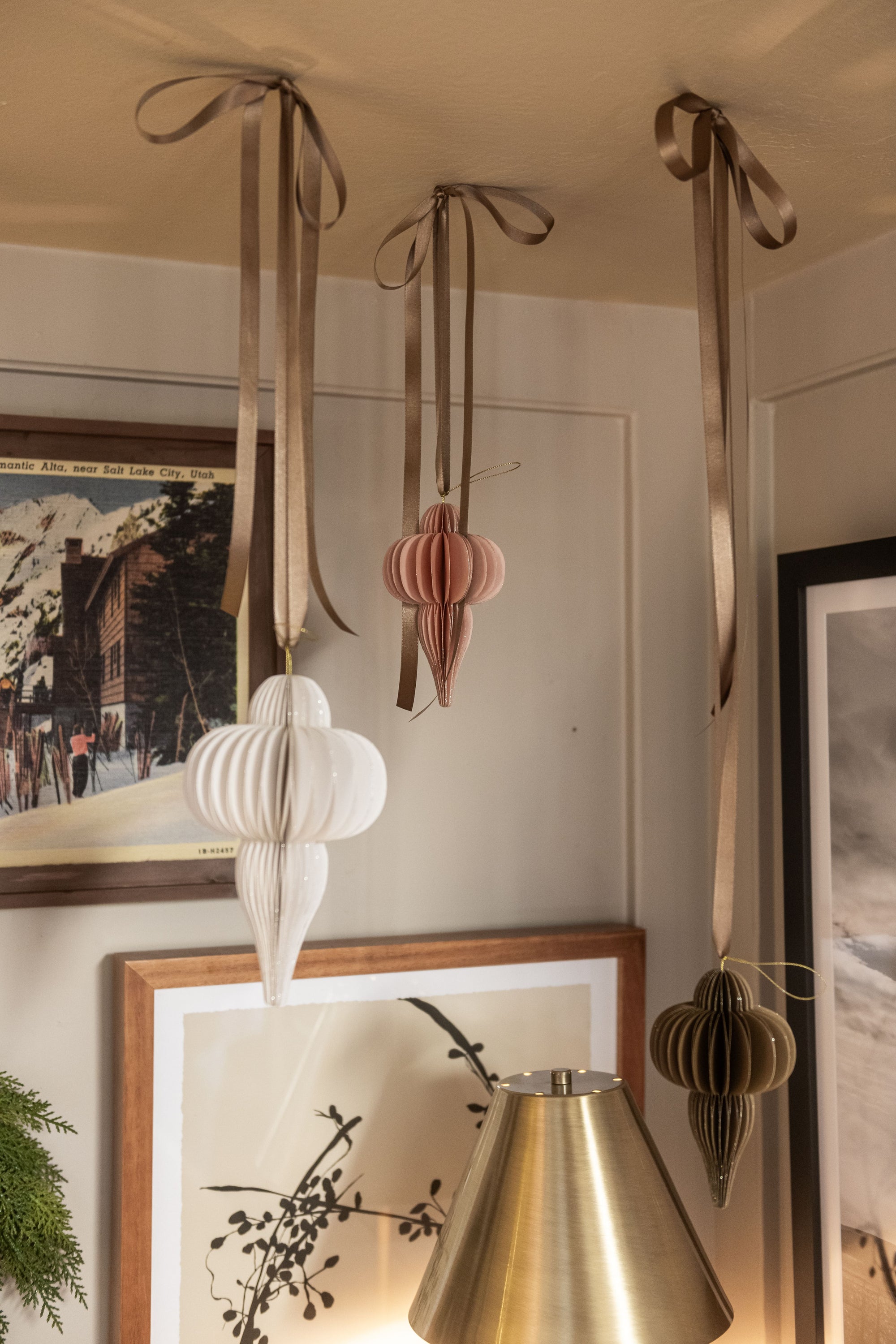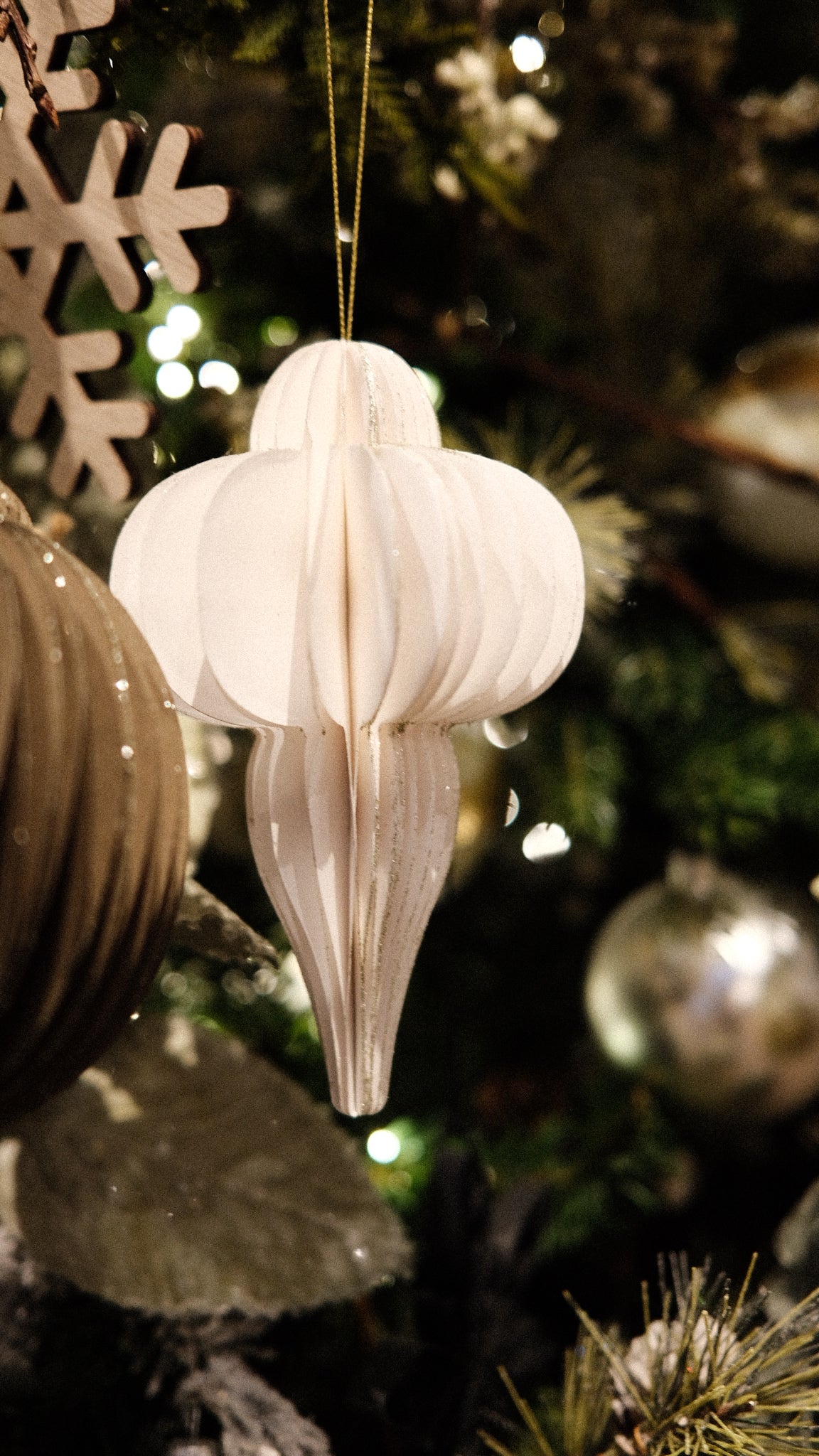 Beautifully crafted paper, cut and folded into a finial ornament shape. Details of a glittered edge, accentuates the shape to pop wherever you style it. This ornament comes folded laying flat, for easy storage. Simply unfold into the three dimensional ornament shape and hang on your tree.