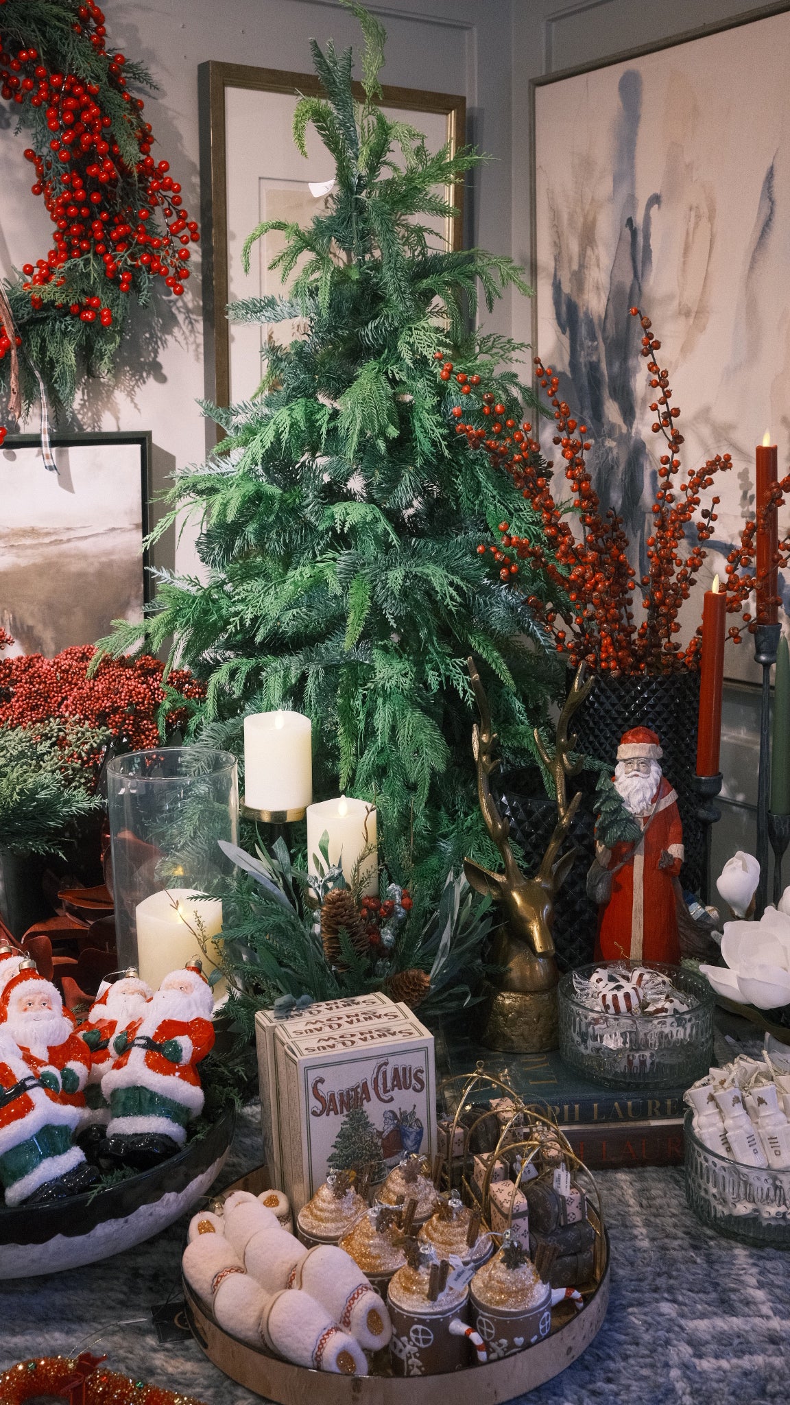 Elevate your holiday decor with this 46" Wild Cedar & Pine Potted Tree. Its medium size and naturally untamed silhouette bring an organic elegance to any space. Crafted from realistic cedar and pine branches, this faux tree offers lasting beauty. Presented in a textured green and red paper machè pot, it adds an elegantly whimsical seasonal touch for your winter home.