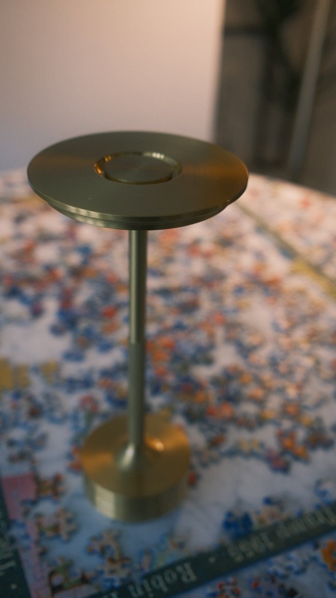 a modern and minimal shape meets a beautiful golden brass finish on this table light. Standing at 11" in height and 5" in diameter. Featuring dimmable settings of warm white, cool light or a warm/cool light mix LED. Battery operated and recharge with a USB-C. Made from aluminum metals. Intended for indoor use only. Perfectly portable for use in any room, year round.