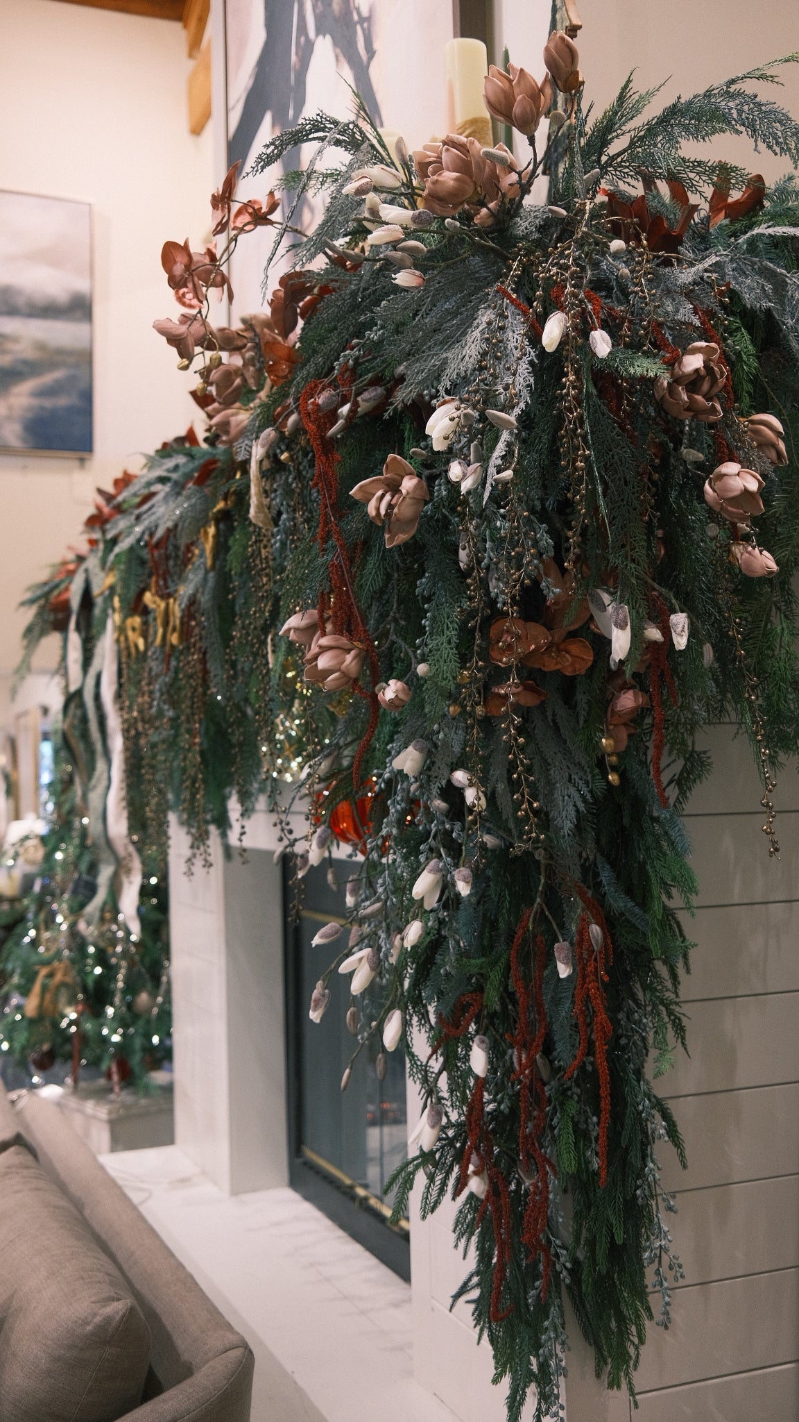 Our Gatehouse Signature Cedar Spray with a wintery frosted layer. The lush realistic cedar stem measures 40" in length. The snowed white coloring give the look of flocking without the constant shedding mess.
