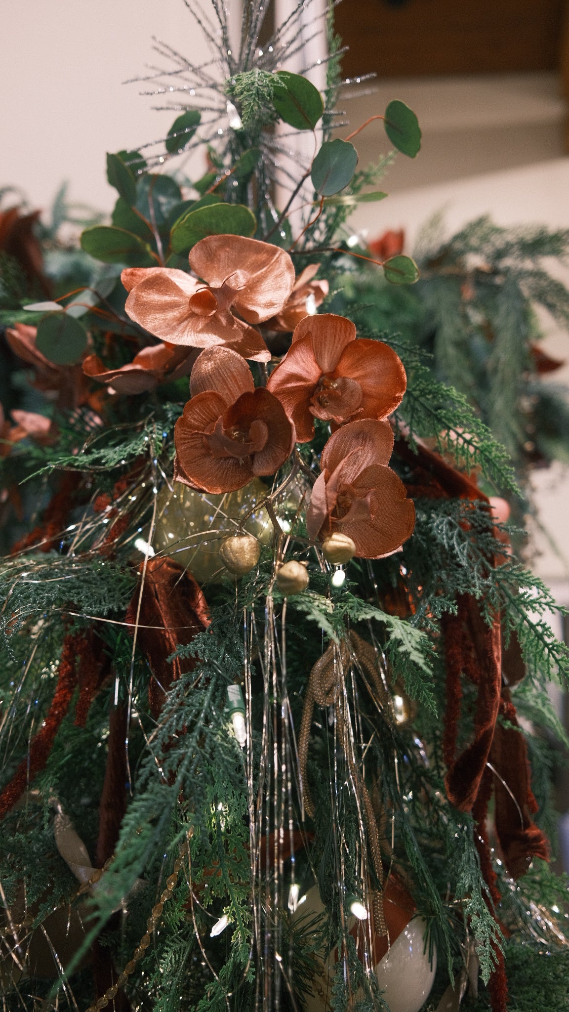 This 31-inch Velvet Orchid Spray features luxurious deep mauve petals with subtle burgundy undertones, crafted from elegant velvet. The classic orchid shape gracefully hangs downward, while delicate gold seeds along the stem provide a refined contrast, making it a sophisticated accent for any decor.